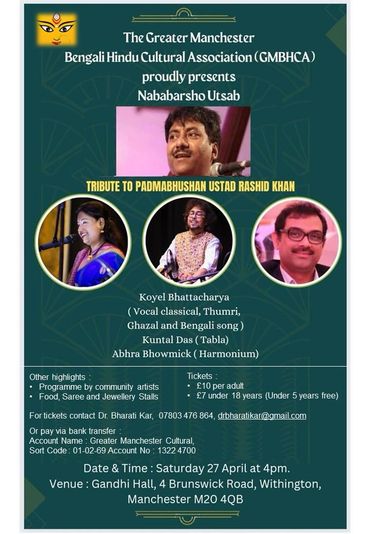 The Greater Manchester Bengali Hindu Cultural Association celebrates Hindu social and religious festivals that include Durga Puja, Lakshmi Puja, Kali Puja or Diwali, Saraswati Puja and organises cultural activities such as Bijoya Sammilani, Bengali New Year (Naboborsho) and other functions which include Classical, Folk and Bollywood dances, music and dramas involving the younger generation and guest artists of the community.