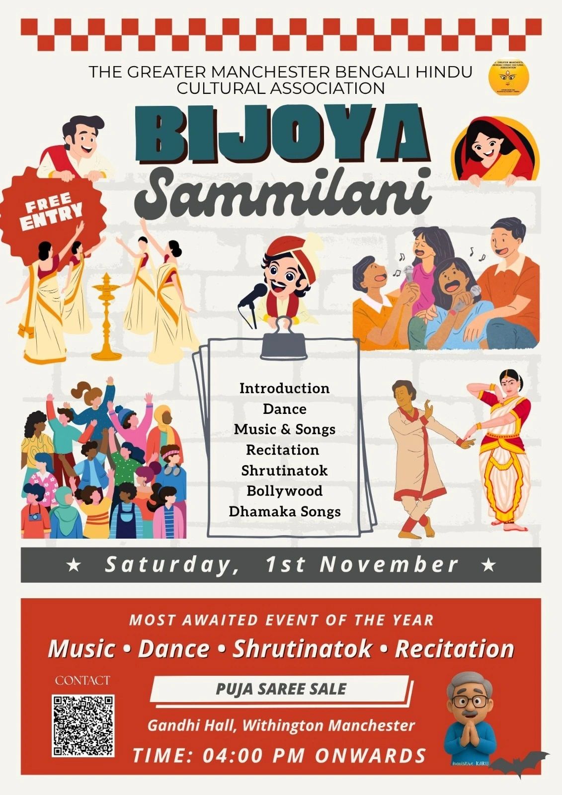 The Greater Manchester Bengali Hindu Cultural Association celebrates Hindu social and religious festivals that include Durga Puja, Lakshmi Puja, Kali Puja or Diwali, Saraswati Puja and organises cultural activities such as Bijoya Sammilani, Bengali New Year (Naboborsho) and other functions which include Classical, Folk and Bollywood dances, music and dramas involving the younger generation and guest artists of the community.